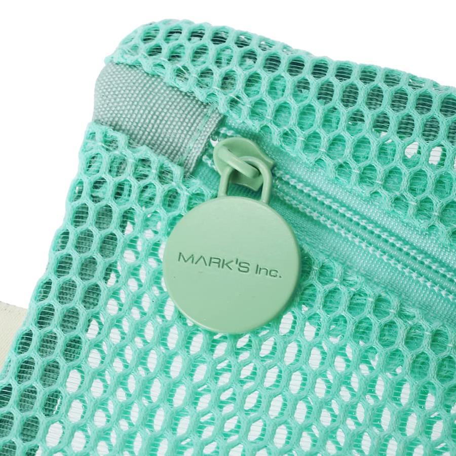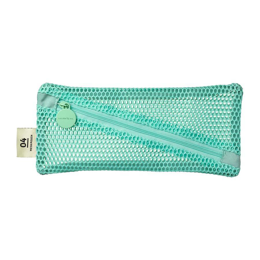 透け感のあるメッシュ素材を使用しており、中身が見やすく、ななめにあしらわれたファスナーがアクセントのデザインです。マチ幅のないフォルムで、すっきりと持ち運びできるのも嬉しいポイント。