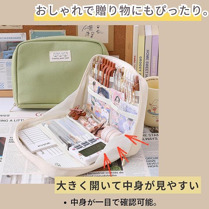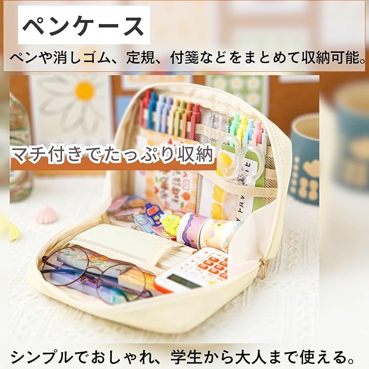 「マチ付きでたっぷり収納できるペンケース」ペンや消しゴム、定規、付箋などの文房具をまとめて収納できます。