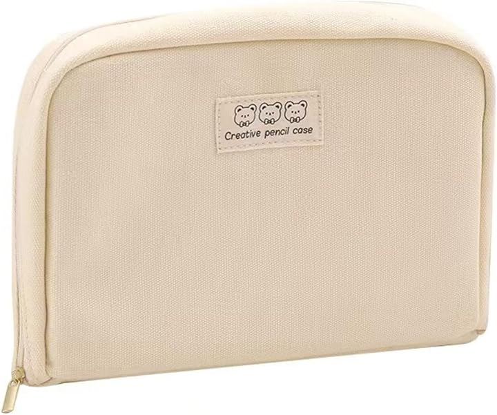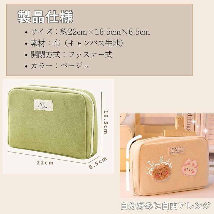 「製品仕様」サイズ:約22cmx16.5cmx6.5cm 素材:布(キャンバス生地) 開閉方式:ファスナー式 カラー:ベージュ