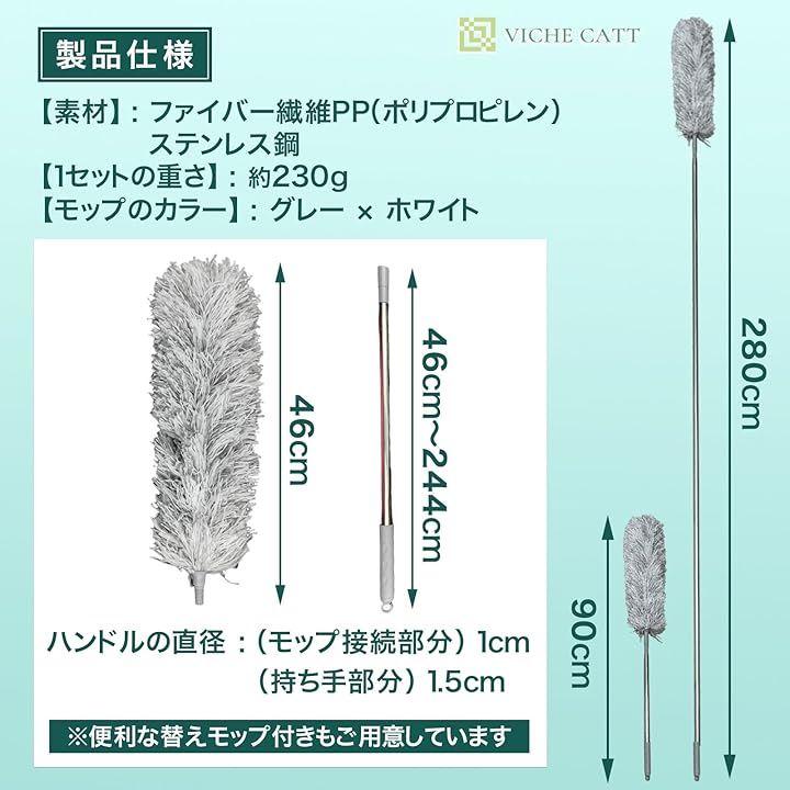 「サイズ」モップの長さ:46cm 伸縮ハンドルの長さ:46cm~244cm、ハンドルの直径:(モップ接続部分)1cm、(持ち手部分)1.5cm モップを取り付けた長さ:約90cm~280cm 「モップのカラー」グレーxホワイト 「素材」ファイバー繊維PP(ポリプロピレン)+ステンレス鋼 「重さ」1セット:約230g。