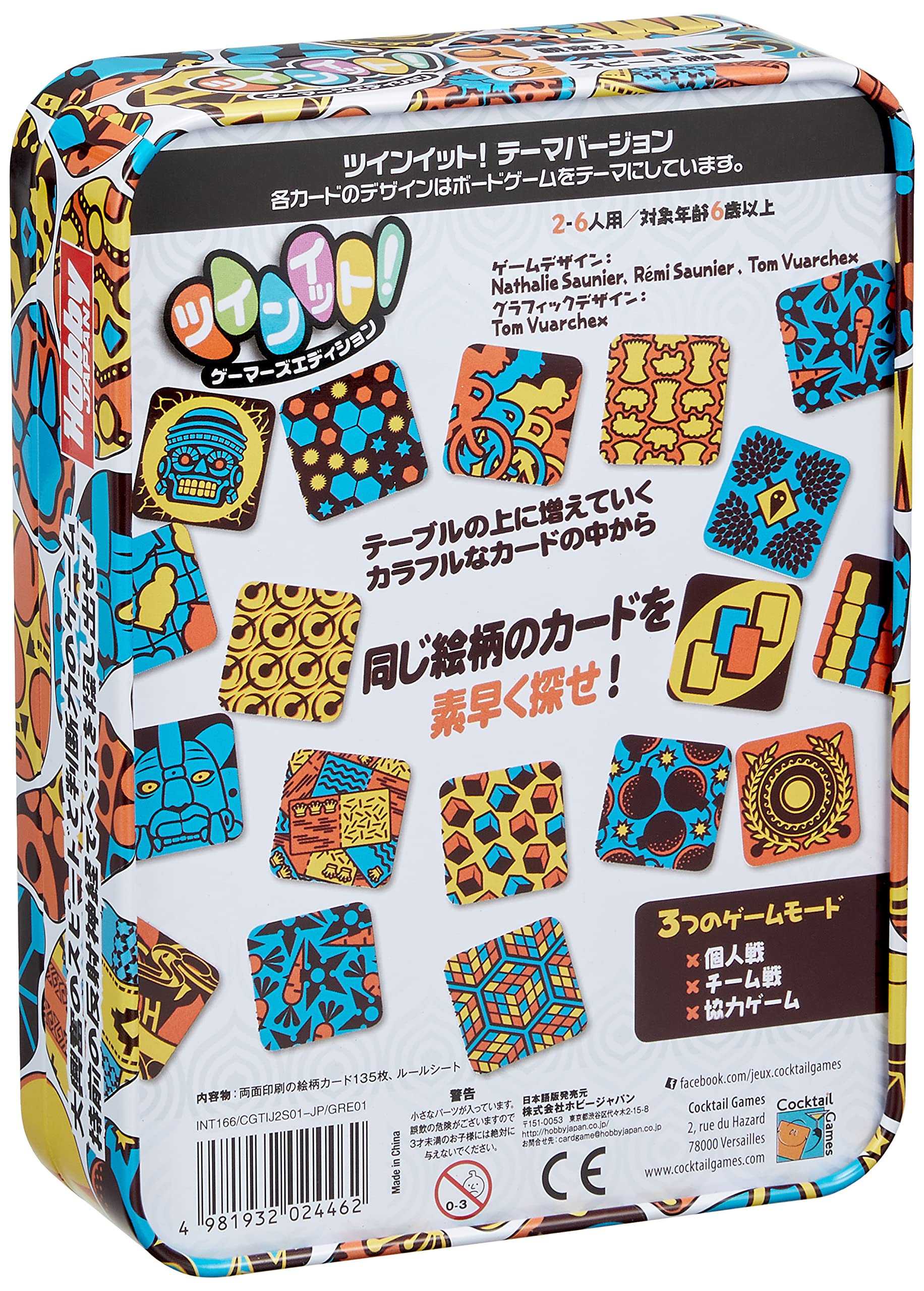 テーブルの上に増えていくカラフルなカードの中から同じ絵柄のカードを、素早く探し出せ。パーティカードゲーム「ツインイット!」にボードゲームをテーマにしたバージョンが登場。「ゲーマーズエディション」は、119種類の有名なボードゲームが カードにデザインされた、特別なバージョンになります。 どのカードがどのゲームかわかるかな?カラフルな幾何学模様が描かれた両面印刷の正方形のカードが135枚。同じ絵柄は、それぞれ2枚または3枚ずつ存在します。プレイヤーは順番に自分の山札から1枚ずつカードをめくってテーブルの上に出していきます。同じ絵柄のカード2枚が出現したら、そのカードを早く取れた人が勝ちとなります。この要領で、競技モード(個人戦)、チーム戦、協力ゲームの3つのモードでゲームプレイが楽しめます。ただし、類似図形・色使いなど、絵柄に巧妙な罠が隠されているので注意すること。判断力とスピードが試される、見た目も美しいパーティカードゲームです。