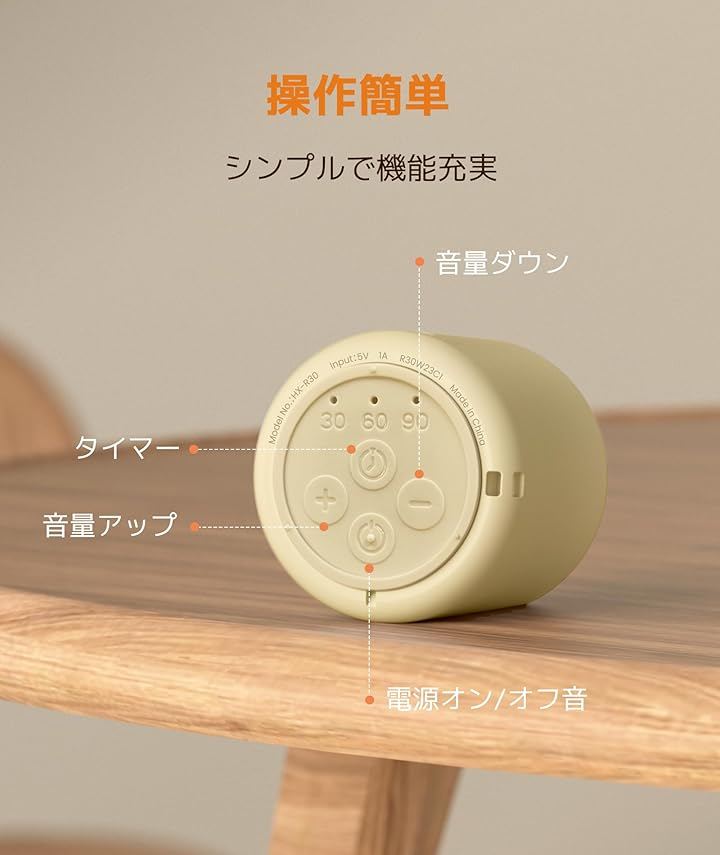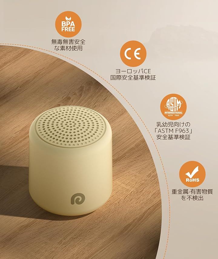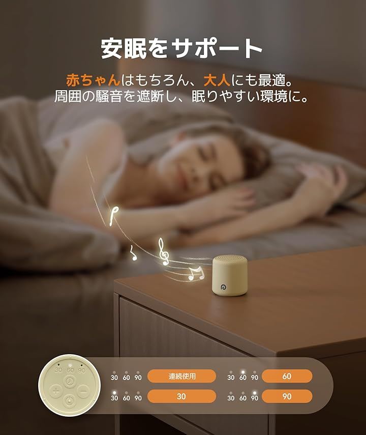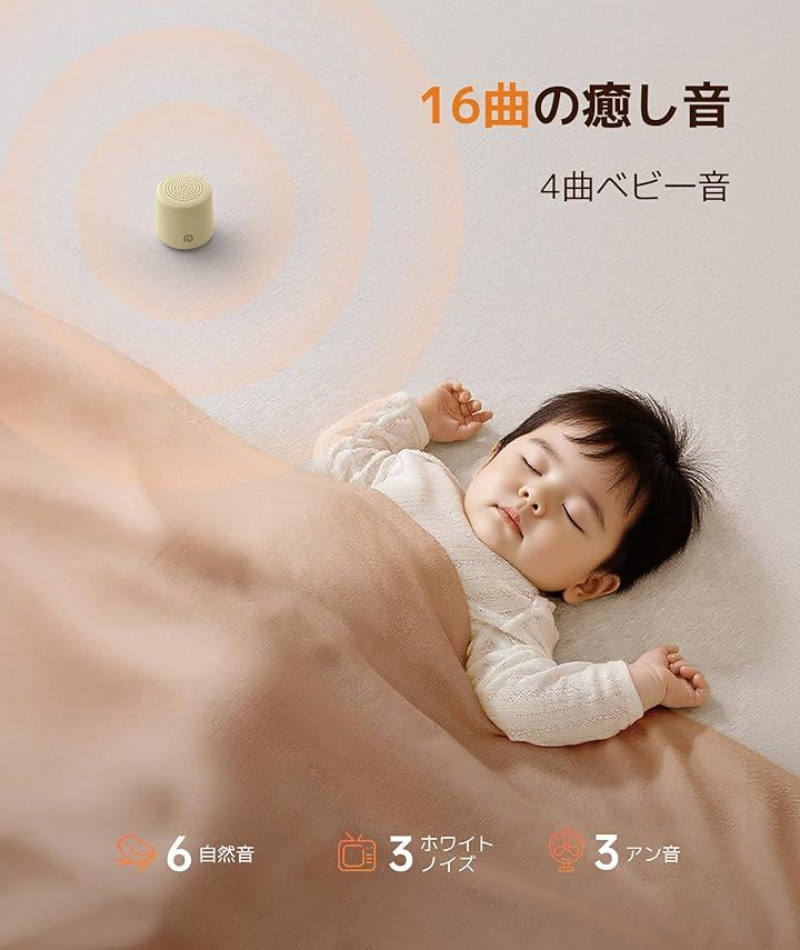 「16種類の癒やしサウンド収録」赤ちゃんの向け音(睡眠オルゴール、シューベルトの子守唄、「すーすー」の音)が用意し、睡眠にリラックスできる小鳥の囀り、海の波打ち、虫の鳴き声、川のせせらぎ、雨の音、春の雨、篝火の音など7種類の自然音)が収録され、ホワイトノイズ(ブラウンノイズ、ピンクノイズ、ホワイトノイズ)とファン音も3曲別々備えています。