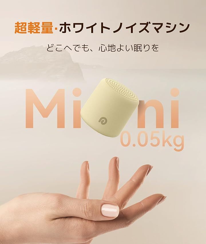 「超小型&吊り下げひも付き」わずか50gx4.5x4.5x4.8cmの超小型ホワイトノイズマシン。