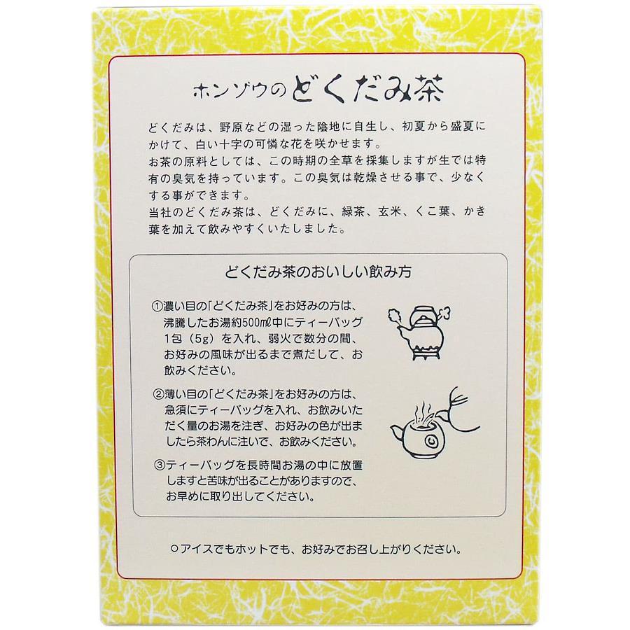 【お召し上がり方】1.濃い目のどくだみ茶をお好みの方は、沸騰水約500mL中にティーバッグを入れ、弱火で数分の間、お好みの風味が出るまで煮出して、お飲みください。2.薄い目のどくだみ茶をお好みの方は、急須にティーバッグを入れ、お飲みいただく量のお湯を注ぎ、お好みの色が出ましたら、茶わんに注いで、お飲みください。3.ティーバッグを長時間お湯の中に放置しますと苦味が出ることがありますので、お早めに取り出してください。