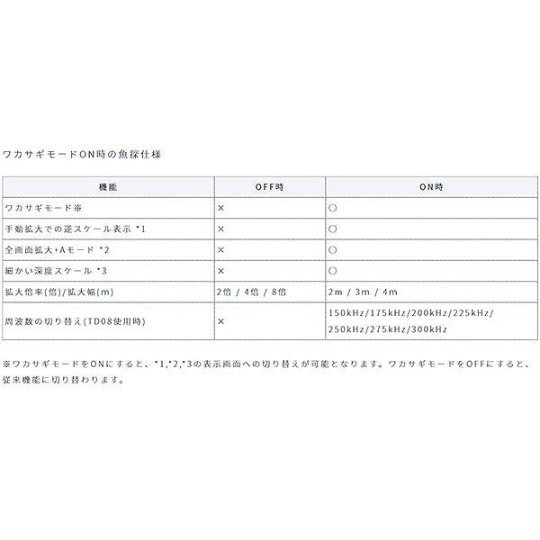 ワカサギ探知に最適なポータブル魚探&専用振動子のパック!ワカサギ釣り用に開発した専用振動子TD08は、指向角が狭いため、ピンポイントで真下の様子を捉えることができます。傾斜地ではより正確に湖底の様子を把握でき、湖底に着いたワカサギを判別するのに有効です。また、指向角が狭いとワカサギ釣りのドーム船では隣客の魚探との超音波が重なりにくいため、混信やゴーストが起こりにくくなります。(注意) 指向角が狭い分、湖流が強いときには仕掛けが探知範囲から外れて映らなくなる場合があります。TD08はフロート(浮き)付きで、水中に降ろすだけですぐに使うことができます(フロートは取り外して使うこともできます)。新開発のワカサギ釣り用 広帯域振動子。150kHz~300kHzの中で周波数を7パターンより選択可能です。ワカサギ氷上釣りやボート釣りではキモになる釣りポイント選びですが、PS-611CNワカサギパックでは全国地図を標準搭載。もちろん釣れたポイントへマーク入力することもでき、自分だけのデータを蓄積できます。 ※仕様につきましては2枚目以降の画像を確認してください。 セット内容:PS-611CN本体(ケースカバー・ノブボルト付属)、吊下げ型振動子 TD08(150-300kHz/100W) コード長:2m、BMO製バッテリーパック(充電器付き) ※実物と色が違って見える場合があります。あらかじめご了承下さい。