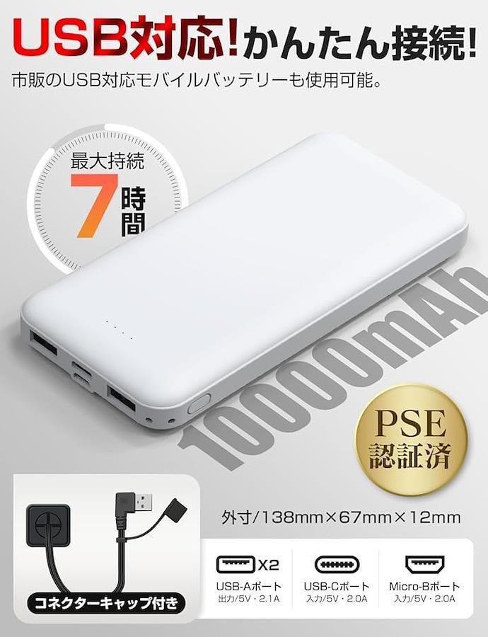 USB給電式で簡単使用。USB-A接続でOK、市販の5V/2.1Aバッテリーも対応。