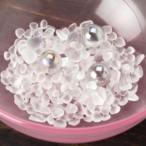 浮き玉を楽しんでいただくために入荷した水鉢。浮き玉は入っていませんが、カラー砂利と、水泡をイメージした透明のビー玉が付属しています。