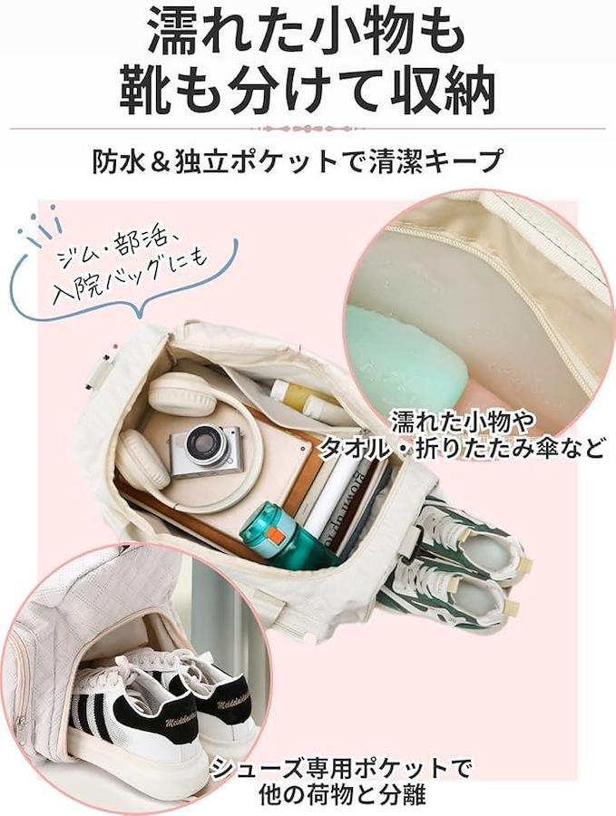 「乾湿分離ポケット・シューズ収納付き」防水加工された乾湿分離ポケットを搭載しており、濡れたハンカチやタオル、折りたたみ傘などの小物を分けて収納できます。