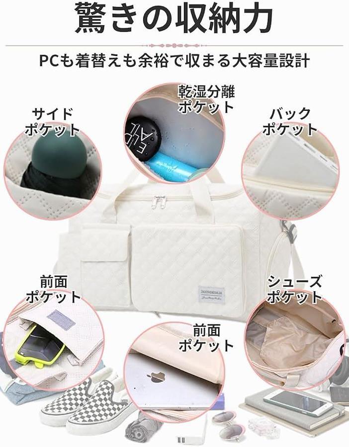 旅行やジム、フィットネス、ヨガ、ゴルフ、合宿、出張など、幅広いシーンに対応する実用性の高いバッグです。