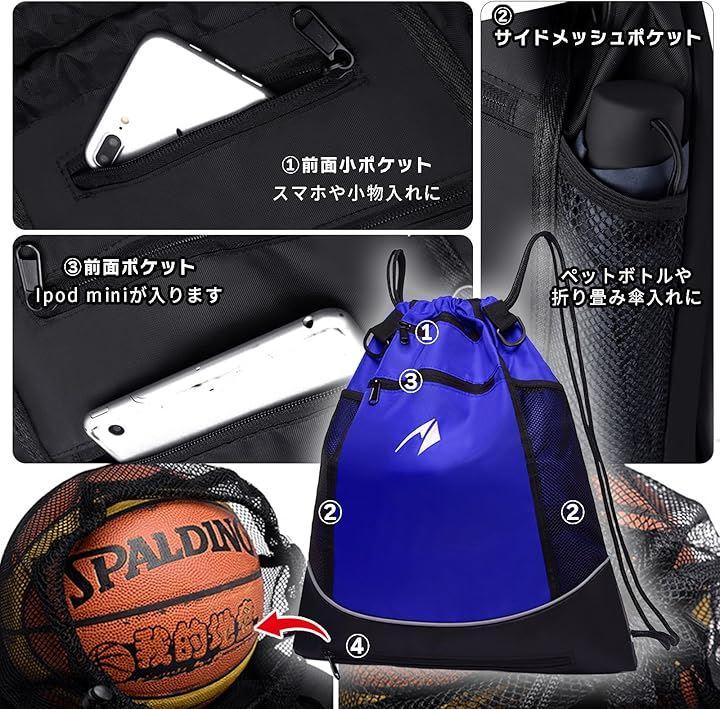 「ボール専用メッシュ袋付きで持ち運びスムーズ」 本体前面に装備されたメッシュ素材のボール収納袋は、バスケットボール・サッカーボール・バレーボールなどの7号・5号サイズにも対応した設計。