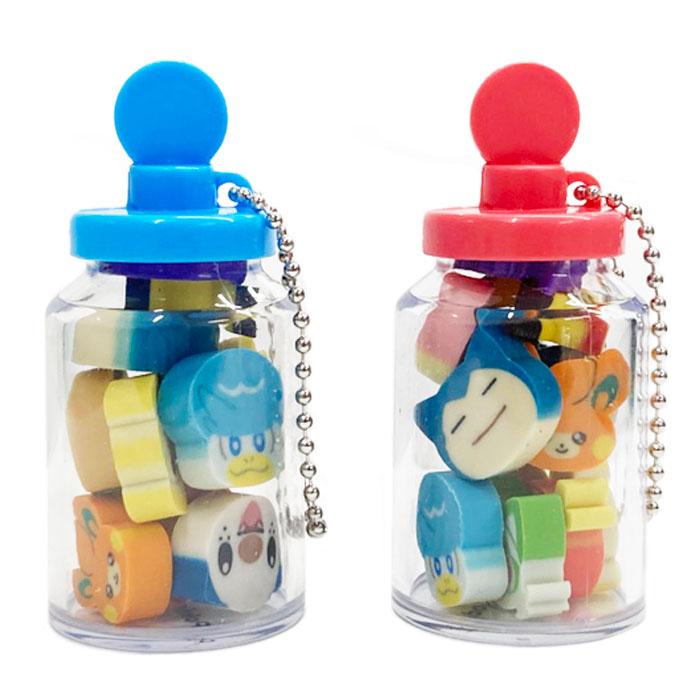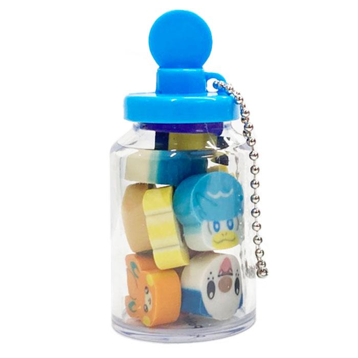 透明なボトルの中に、12種類の小さな消しゴムが入っています。