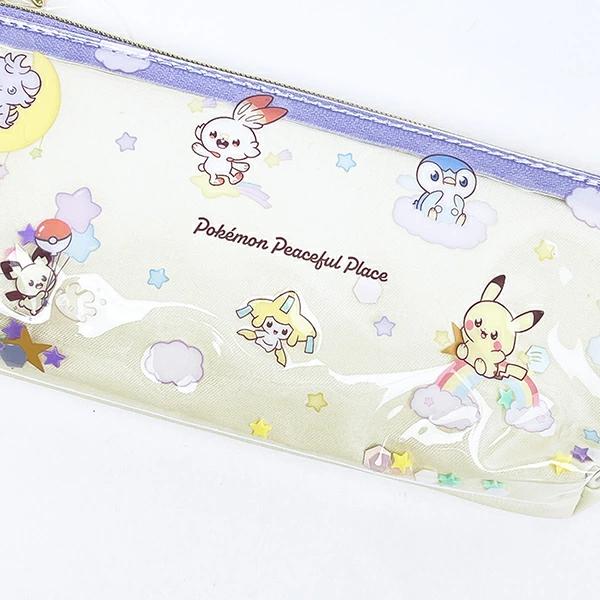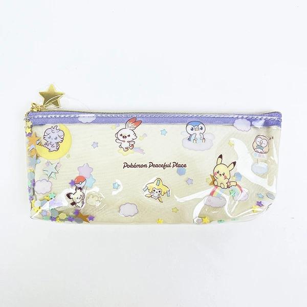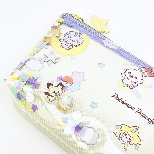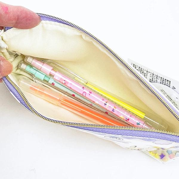 正面のクリア素材の内側にシャカシャカビーズが入っていて、動かすたびにキラキラしてカワイイポーチです。小物を入れたりペンケースとしても◎