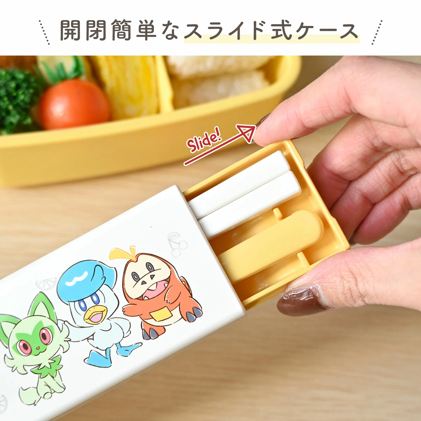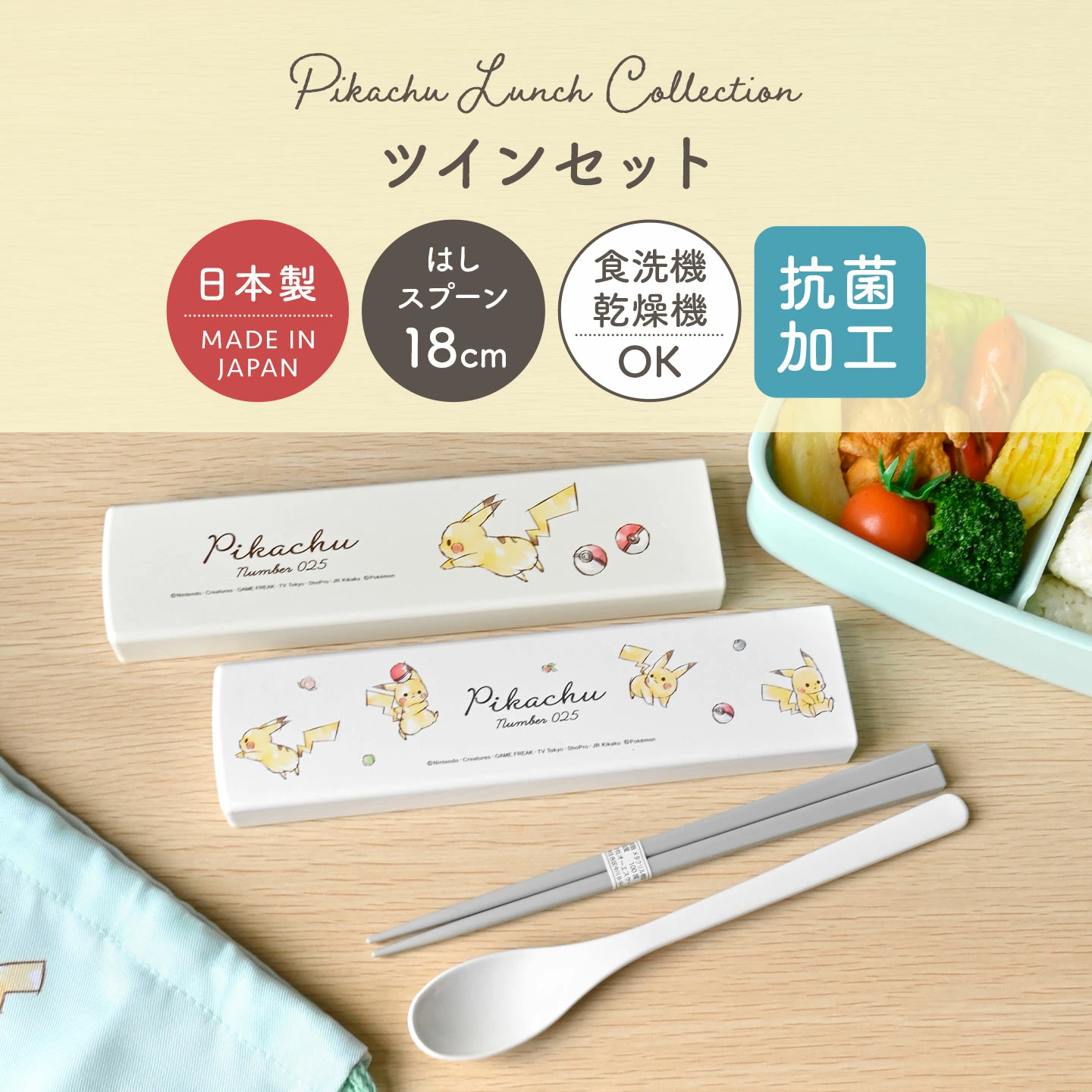 【ツインセット/スライド式】大人気ポケモンのツインセット。便利なお箸&スプーンのセットです。開閉しやすいスライドケース付きで持ち運びも安心!シリコーンパーツが付いているので持ち運ぶ時にカチャカチャ音が鳴りません。安心の日本製・抗菌加工、さらに食洗機もOKでお手入れも簡単!同じ柄のランチグッズで揃えて使うのもおすすめです♪
