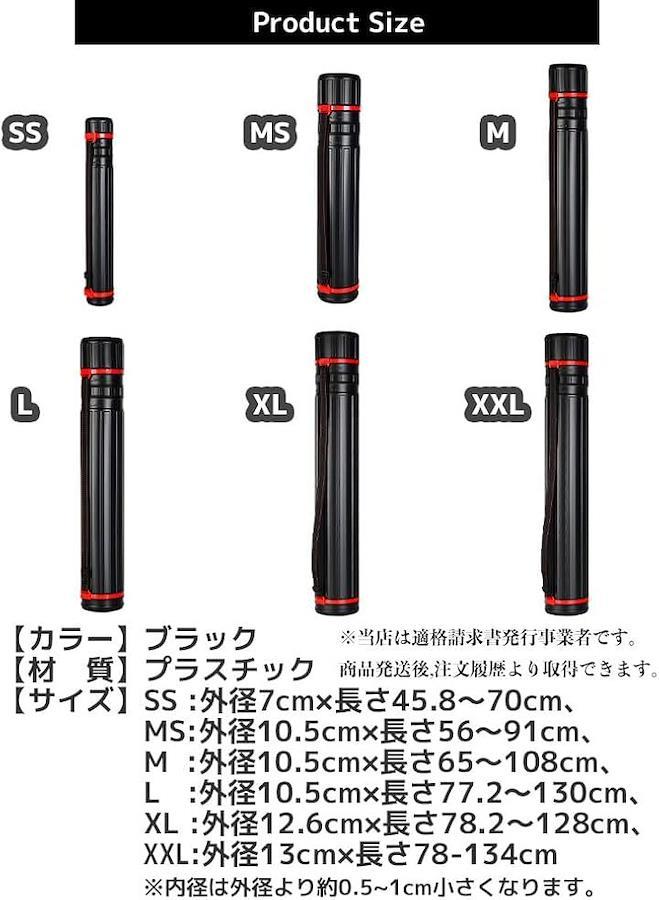 「カラー」ブラック「材質」プラスチック「サイズ」SS:外径7cmx長さ45.8~70cm、MS:外径10.5cmx長さ56~91cm、M:外径10.5cmx長さ65~108cm、L:外径10.5cmx長さ77.2~130cm、XL:外径12.6cmx長さ78.2~128cm、XXL:外径13cmx長さ78-134cm *内径は外径より約0.5~1cm小さくなります。
