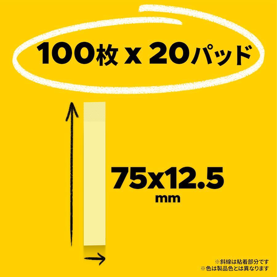 ●ふせんサイズ: 75 x 12.5mm。 見出しやしおりに使いやすい、細長いサイズのポストイット付箋です。●くり返し貼ったりはがしたりでき、相手をいためません。●100枚x20パッド。●たっぷり入ってお買い得。オフィスでの買い置きにおすすめです。●色:イエロー●リサイクル:古紙パルプ配合率100%の再生紙を使用。●エコマーク取得。●グリーンマーク取得。グリーン購入法適合。●GPNエコ商品ねっと掲載。●中身が見やすく取り出しやすい、収納に便利な紙箱入り。