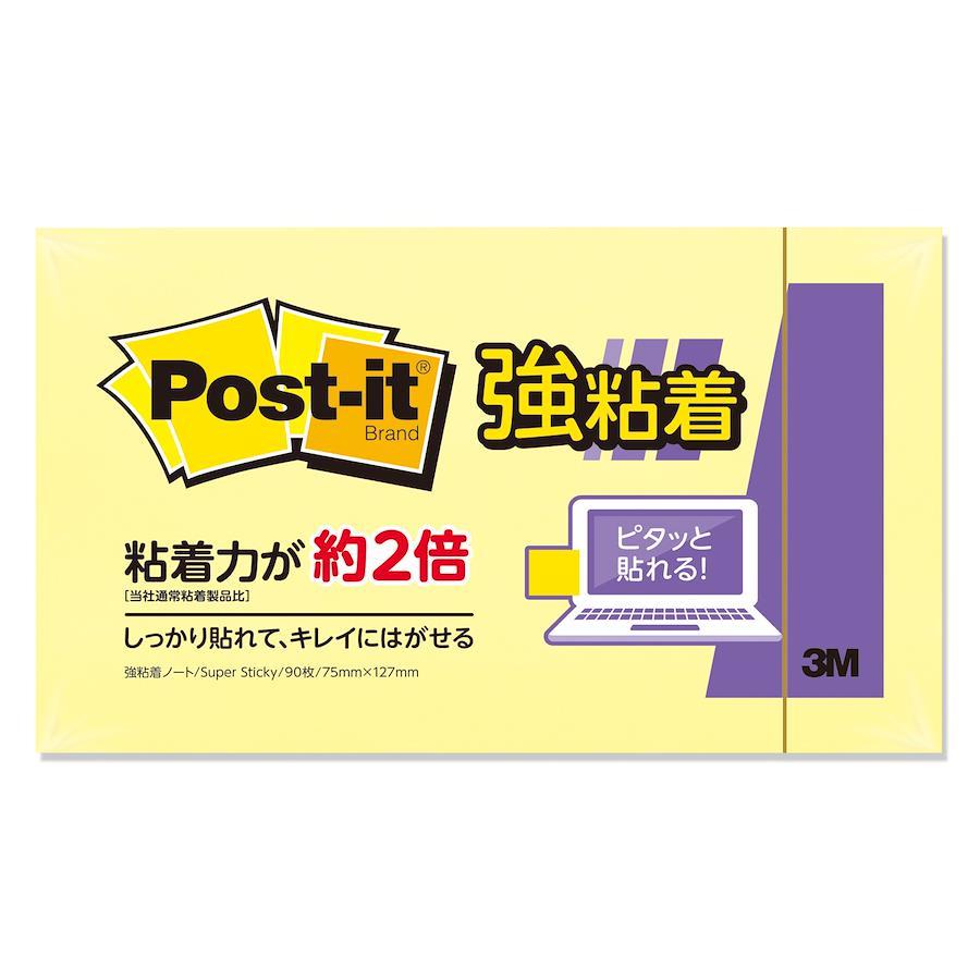 ●ふせんサイズ:75x127mm。 たっぷり書き込める大判サイズのポストイット付箋。詳しい伝言や記録、掲示や在庫整理などに便利なサイズです。●約2倍*の強粘着タイプで、クリアファイルやパソコン、電話などの樹脂面や、キャビネットや家具などのスチール面、扉、壁などの垂直面、ダンボールなど、つきにくかった場所にもしっかり貼れるので、大切な伝言やメモに最適です。しっかり貼れてきれいにはがれるのが特長の製品です。(*当社通常粘着比)●90枚x1パッド。●色:イエロー●エコマーク取得。●グリーンマーク取得。グリーン購入法適合。●GPNエコ商品ねっと掲載。