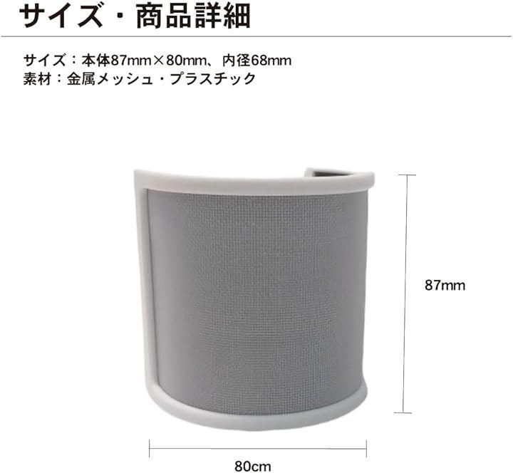 本体サイズは87mmx80mm、内径68mmで、素材には耐久性のある金属メッシュとプラスチックを採用しています。