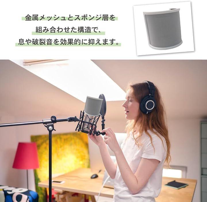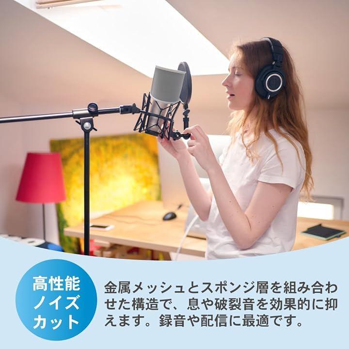 金属メッシュとスポンジ層を組み合わせた構造により、息や破裂音を効果的に抑え、クリアな音質を実現します。