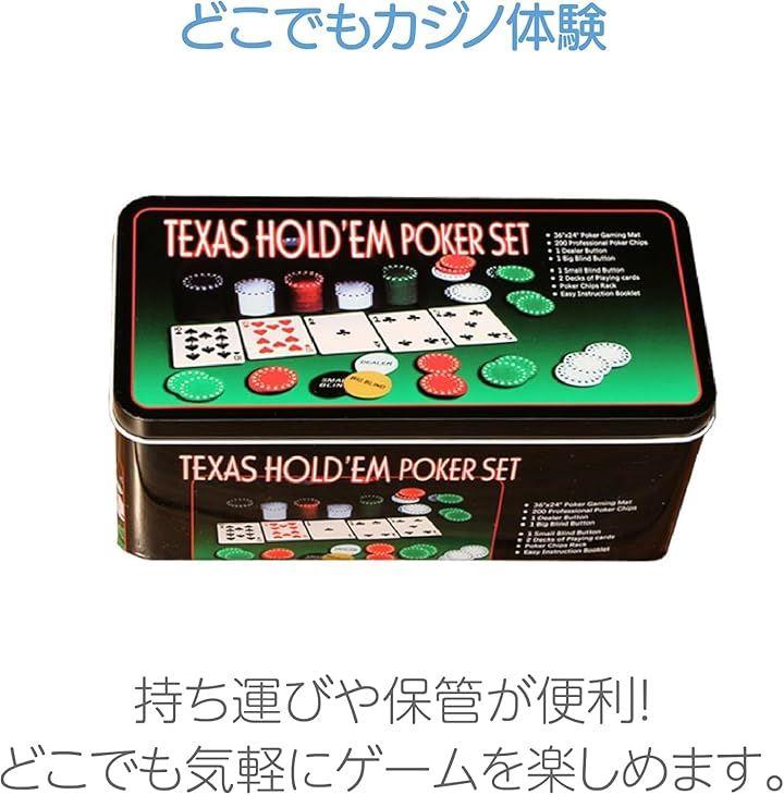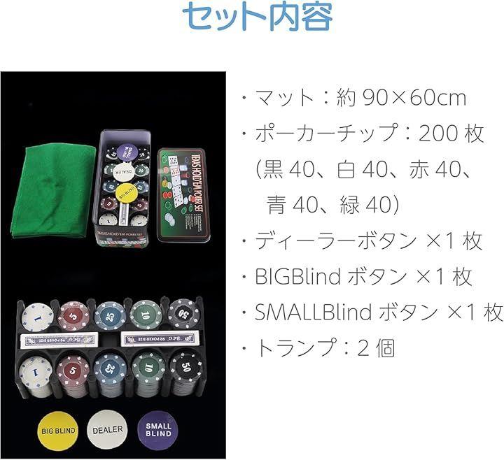 「セット内容」・マット:約90cm x 60cm ・ポーカーチップ:200枚(黒40,白40,赤40,青40,緑40) ・ディーラボタン x 1 ・Bigblindボタン x1 ・Smallblindボタン x 1枚 ・トランプ 2セット