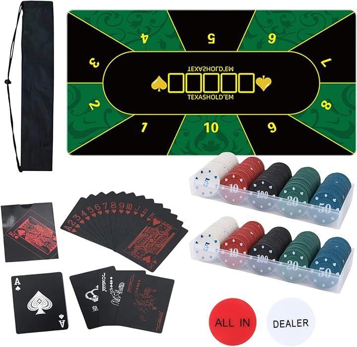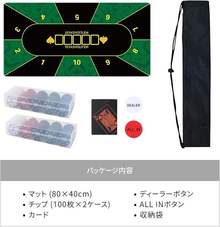 パッケージ内容:マット (80x40cm)、チップ (100枚x2ケース)、カード 、ディーラーボタン、ALL INボタン、収納袋
