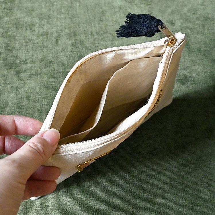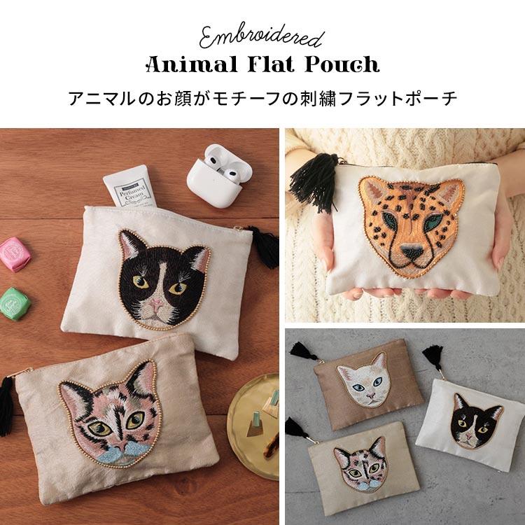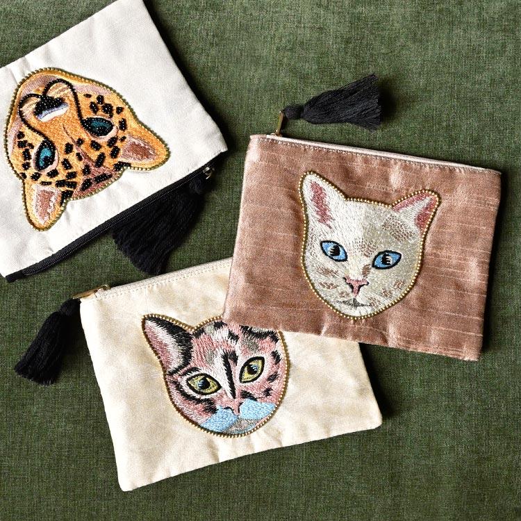 【アニマル刺繍フラットポーチ】インド特有の色鮮やかなビーズ刺繍が施されたファブリックシリーズの、ネコとレオパードのお顔がモチーフの刺繍フラットポーチ。華やかなビーズ刺?は全て職人の手作業により作られている温かみのあるデザインです。持ち歩きの化粧ポーチとしてや小物入れにぴったりのサイズ感です。