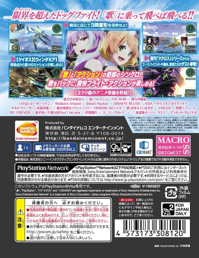 初回封入特典について*画像は開発中のものです。実際の製品とは異なる場合があります。 *一部店舗ではお取り扱いのない場合がございます。詳しくは店頭にてお問い合わせ下さい。 *本特典は初回生産分にのみ封入されております。 *本特典は後日配信を行う可能性があります。予めご了承下さい。 *機体性能は「VF-31J ジ―クフリード ハヤテ機」と同一になります。 *内容、仕様は予告なく変更になる場合がございます。 *プロダクトコードをご利用いただく際には、インターネット接続環境が必要です。また、Sony Entertainment Networkのアカウントが必要になります。 *プロダクトコードには有効期限がございます。 *数に限りがございます。なくなり次第終了となりますのでご了承下さい通常版について*本作に収録されているアニメ楽曲は“フルサイズ"ではなく、“ゲーム用サイズ"になります。 *本作に収録されているアニメ楽曲は、戦闘BGMが変更可能な箇所にて設定することができます。 *歌姫スキル発動時に再生されるアニメ楽曲は、歌姫の持ち歌の中から入れ替えることができます。 *通常版と期間限定生産版では、一部イベント再生時に流れるアニメ楽曲が異なります。 *お客様ご自身の音楽データをゲーム内で再生できる機能はございません。型番 : 4573173308120 限界 (ルビ:ボーダーライン) を超えたドッグファイト! PS Vitaで飛べば飛べる! ! 爽快フライト・アクションが楽しめる、TVアニメ『マクロス』のゲームがPS Vitaに登場! ・「マクロス」の13話“激情 ダイビング"までを描く『キャンペーンミッション』を搭載! ・「ファイター」「ガウォーク」「バトロイド」マクロスならではのバルキリー3段変形が更にパワーアップ! 変形を駆使して、様々な戦況に挑め! ・「歌」と「アクション」の融合! システムと演出強化により、戦闘をさらに盛り上げ、没入感も大幅アップ! ・歴代「マクロス」シリーズからも、エースパイロットや歌姫、機体がゲスト参戦! ・アニメ楽曲をバックに、爽快なドッグファイトが楽しめる! 通常版には20曲のアニメ楽曲が収録され、ミッション中の戦闘BGMとして設定可能。