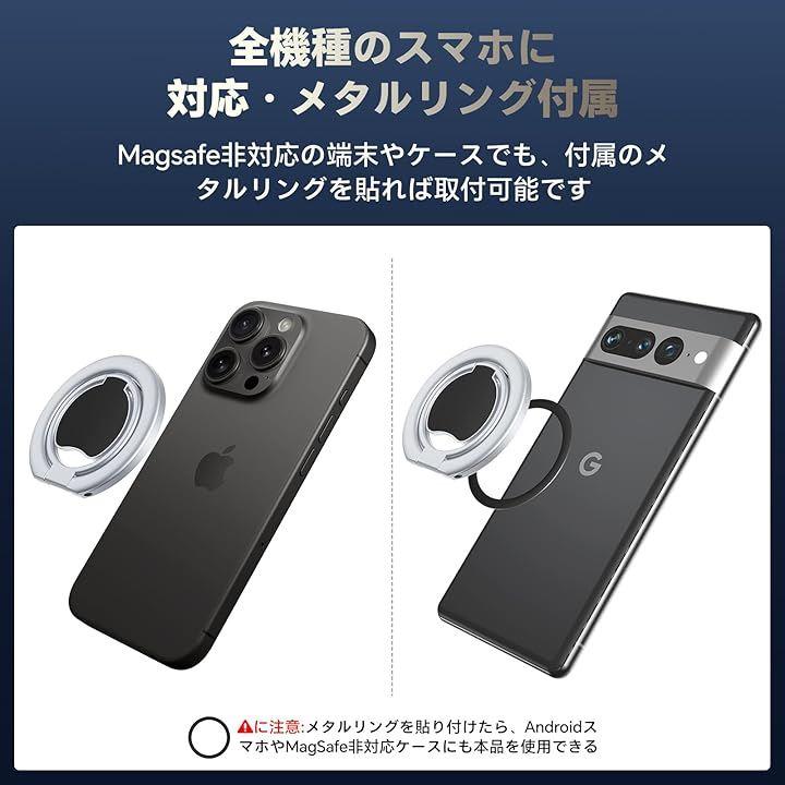 「全機種対応。メタルリング付き」オールOK。iPhone 15/14/13/12、MagSafeケース、磁気ケースにピッタリ。