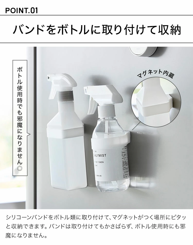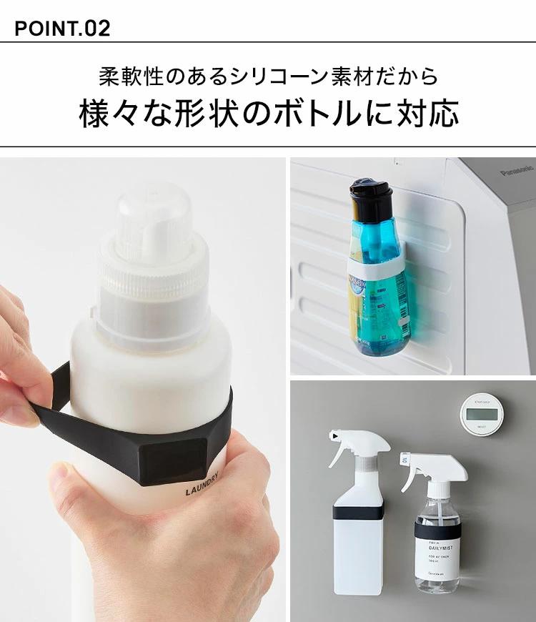 【マグネットシリコーンバンド】マグネットシリコーンバンドで簡単取り付け。置き場所に困るボトル類をお好みの位置に浮かせて収納。シリコーン製のバンドを取り付けるだけ!ジムでトレーニング中、置き場に困るボトルや、デスク周りでの水筒等も浮かせて収納できます。ランドリールームや浴室でボトルを収納する際や、防虫スプレー等を玄関ドアに取り付ける際にもおすすめです。
