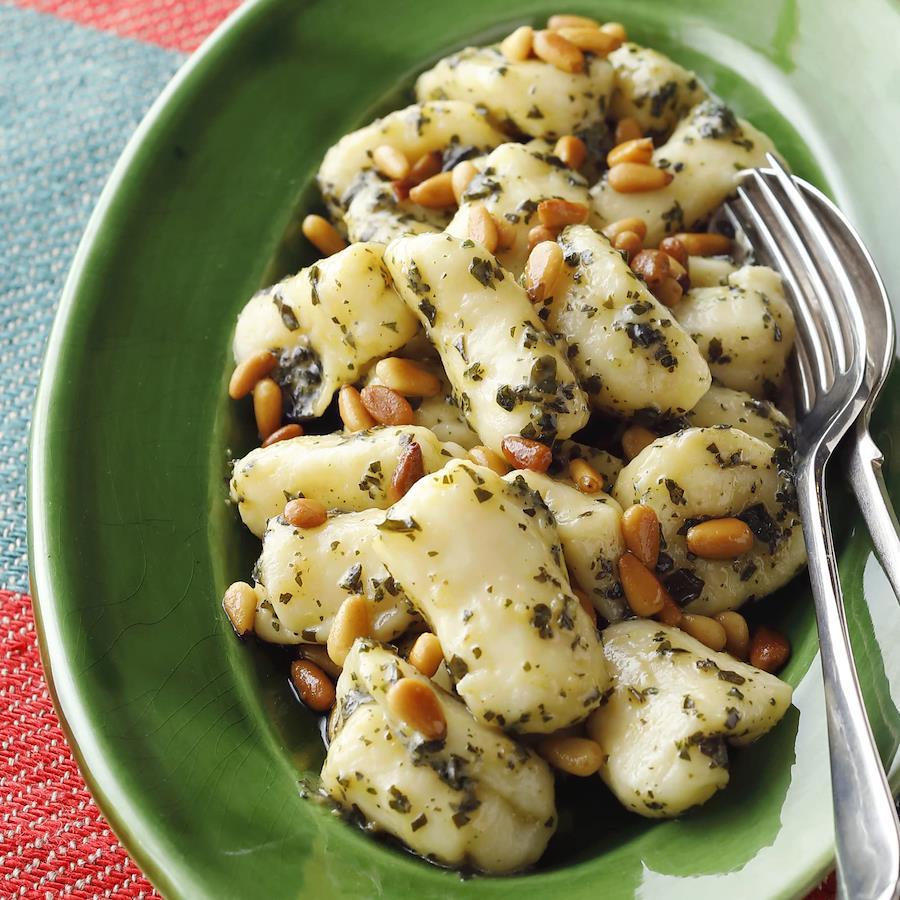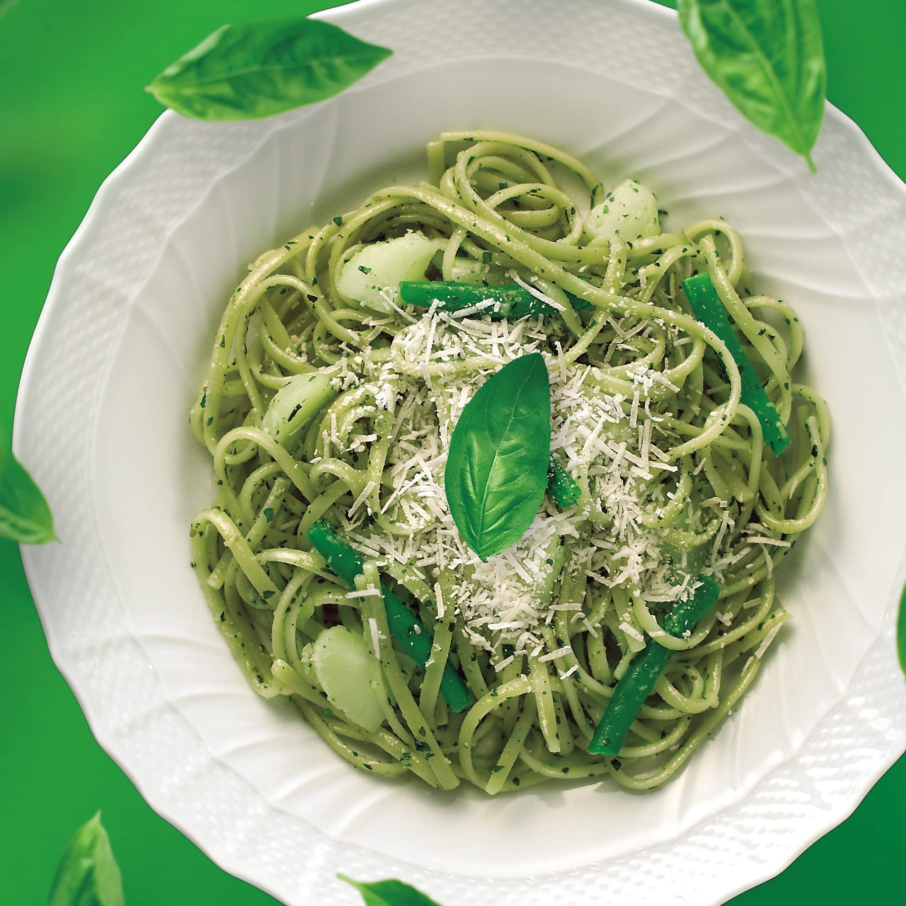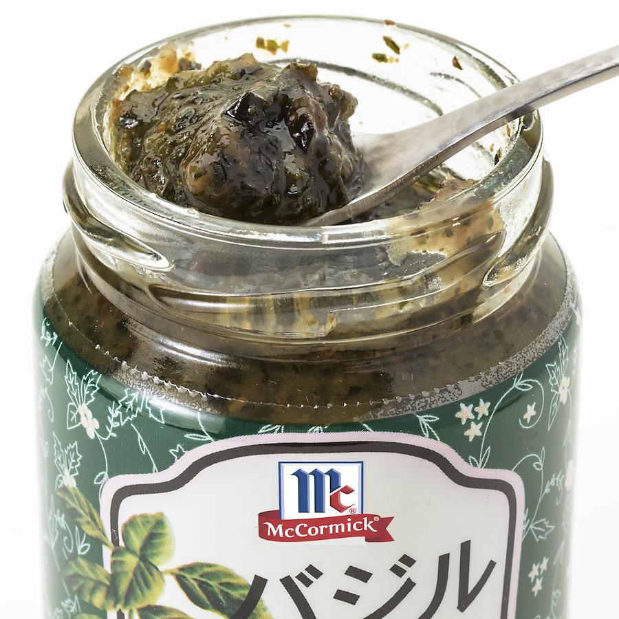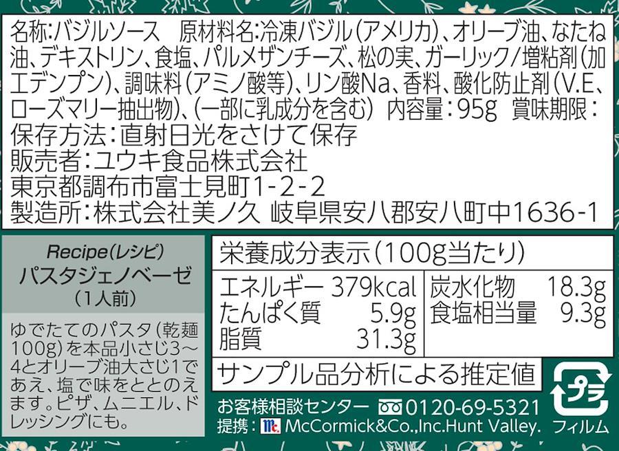 冷凍バジル、オリーブ油、なたね油、デキストリン、食塩、パルメザンチーズ、松の実、ガーリック、増粘剤(加工でん粉)、調味料(アミノ酸等)、リン酸Na、香料、酸化防止剤(ローズマリー抽出物、V.E) ※原材料は原料事情により、変更する可能性がございます。