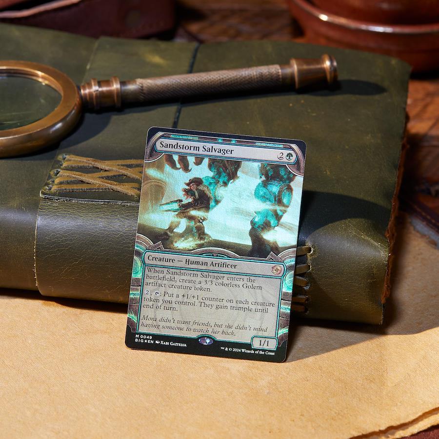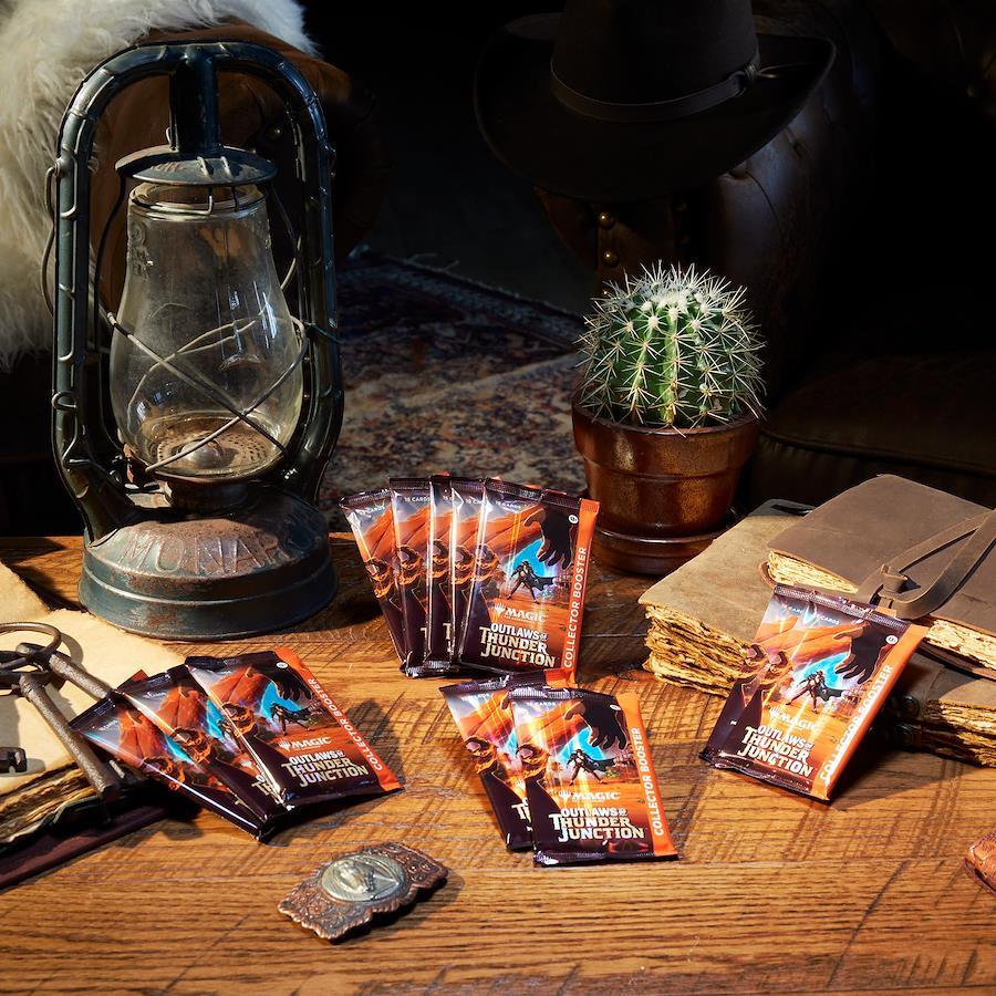 お宝満載の『サンダー・ジャンクションの無法者』コレクター・ブースターボックスを手に、夕日に向かって駆けよう。このボックスには、『サンダー・ジャンクションの無法者』コレクター・ブースターが12パック収められています。各パックには、マジック:ザ・ギャザリングのカード15枚とフォイル仕様の両面トークン1枚が封入されています。マジックのカード15枚の内訳は以下の通りです:レア以上のカード5枚、アンコモン5枚、コモン4枚、「西部」フルアート版土地1枚。すべてのパックに別枠版のカードが6枚、フォイル仕様のカードが合計10~12枚入っており、コレクター・ブースター限定フォイル仕様のカードが出現する可能性もあります。1%未満の確率で、テクスチャー・フォイル仕様の「速報」カードが出現します。
