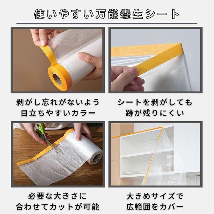 汚したくない場所、 濡らしたくない場所を広範囲でカバー。ペンキ塗装や車の塗装、室内の家具や家電、壁の養生などさまざまな用途でご使用いただけるマスキングテープ付き養生シートです。