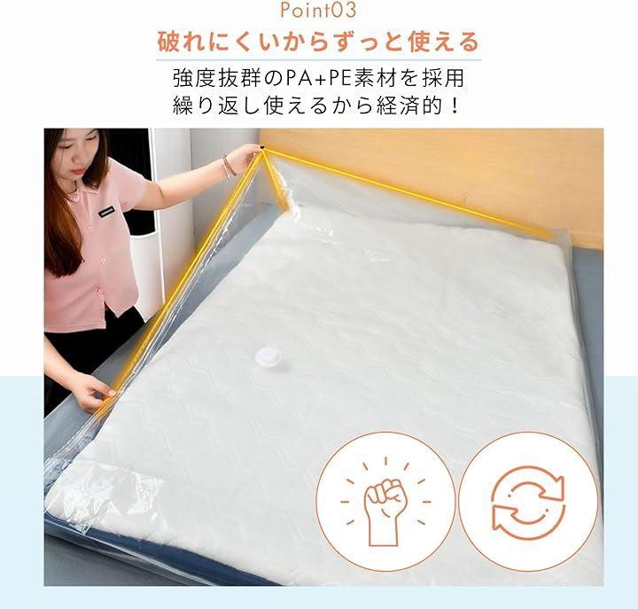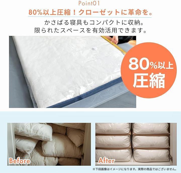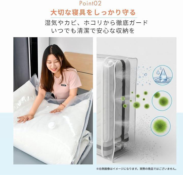 高性能真空シール技術でマットレスや布団を80%以上圧縮し、かさばる寝具もコンパクトに収納可能。