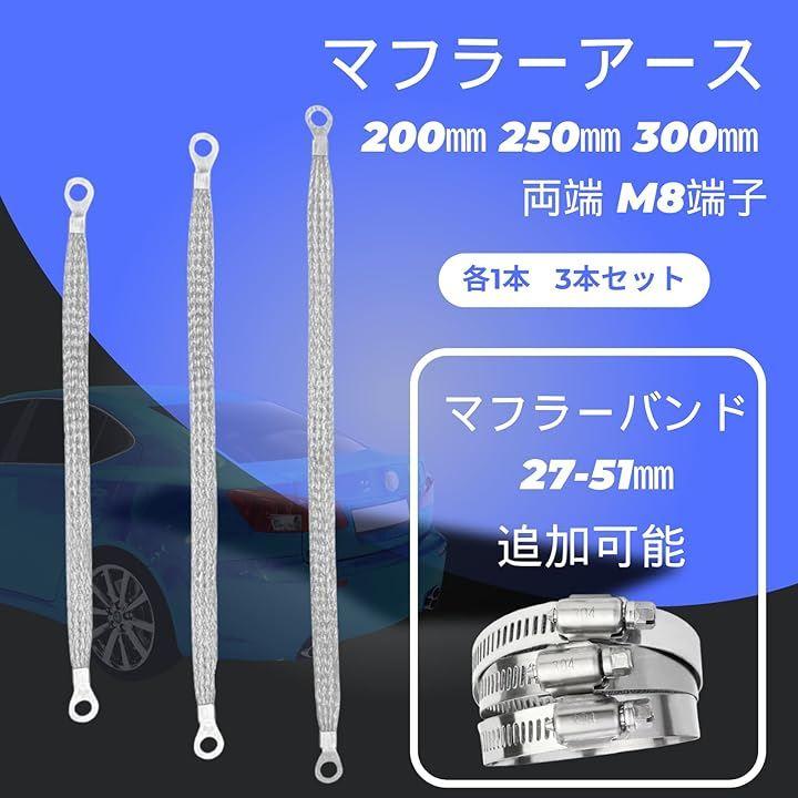 静電気除去 排気効率向上 トルク・レスポンスアップに 「商品仕様」 *セット内容:マフラーアース *サイズ:200mm、250mm、300mm *リング端子内径:両端8mm(M8) *素材:錫メッキ銅 *平編み6sq *マフラーバンド *サイズ:27mm-51mm *素材:ステンレス