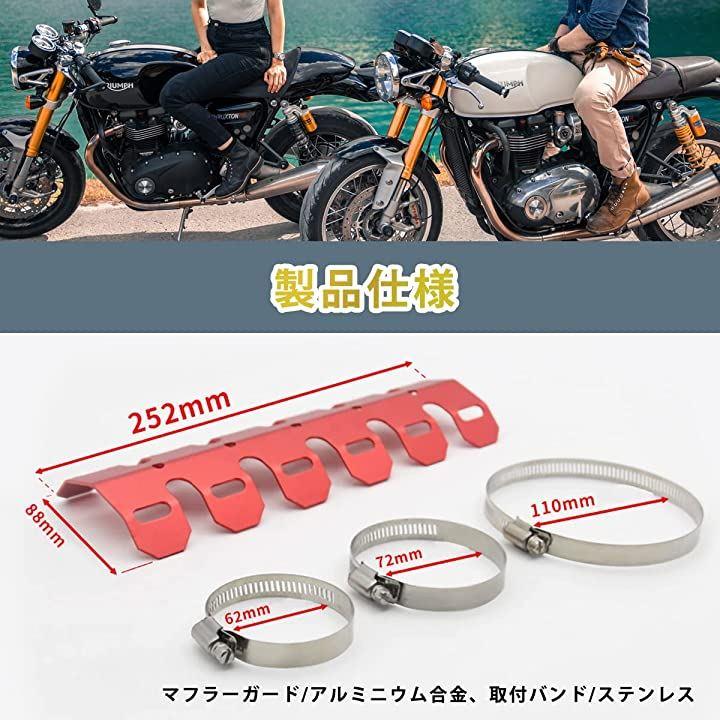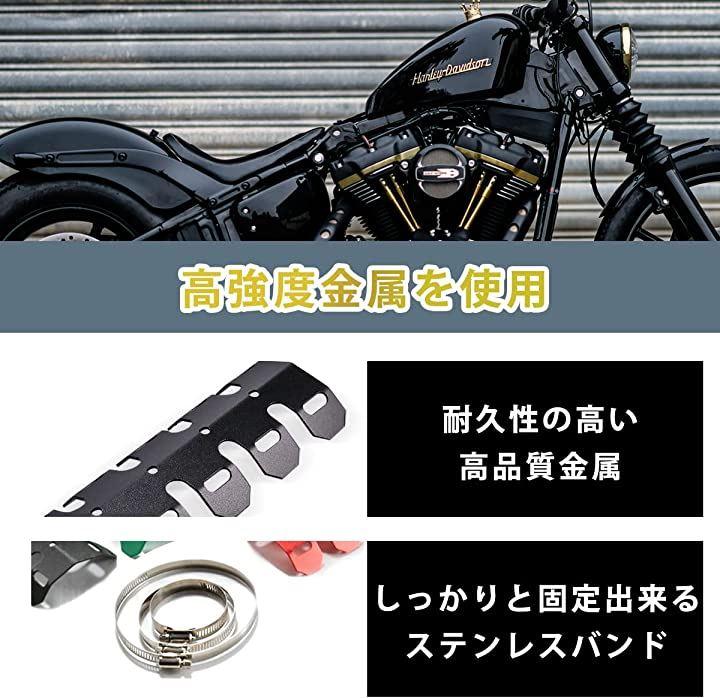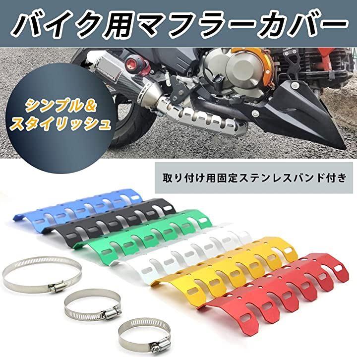 「セット内容」マフラーガード、取付バンド3個「バリエーション」ブラック/レッド/イエロー/ブルー/グリーン/シルバー「材質」マフラーガード/アルミニウム合金、取付バンド/ステンレス