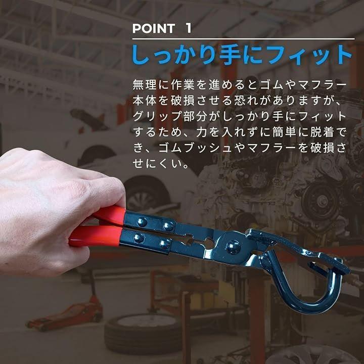 「マフラーハンガーの着脱専用工具」 ゴム製ハンガーを簡単脱着可能。
