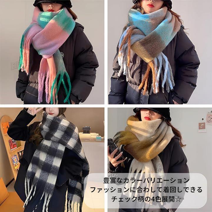 「使用例」 厚手マフラーは、寒い季節の防寒対策には必須アイテムで、首や羽織もの、お子様の昼寝布団としても様々な使い方ができます。。フリンジの長さ20cm.厚さ1cm。
