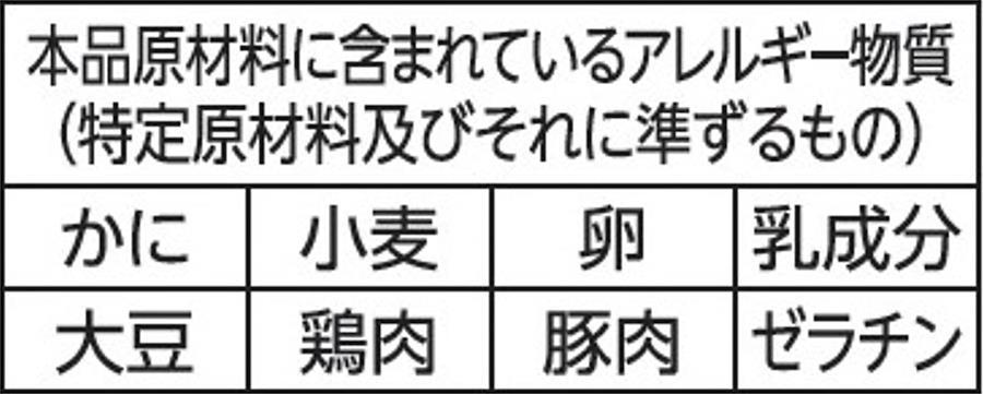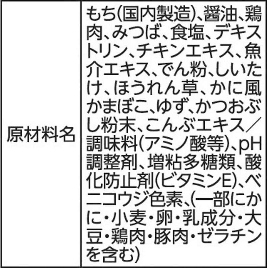 もち(国内製造)、醤油、鶏肉、みつば、食塩、デキストリン、チキンエキス、魚介エキス、でん粉、しいたけ、ほうれん草、かに風かまぼこ、ゆず、かつおぶし粉末、こんぶエキス/調味料(アミノ酸等)、pH調整剤、増粘多糖類、酸化防止剤(ビタミンE)、ベニコウジ色素、(一部にかに・小麦・卵・乳成分・大豆・鶏肉・豚肉・ゼラチンを含む)