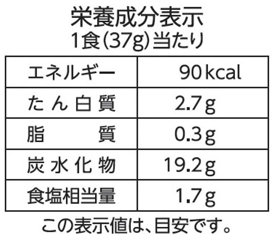 エネルギー90kcal、たん白質2.7g、脂質0.3g、炭水化物19.2g、食塩相当量1.7g・・(1食(37g)あたり)