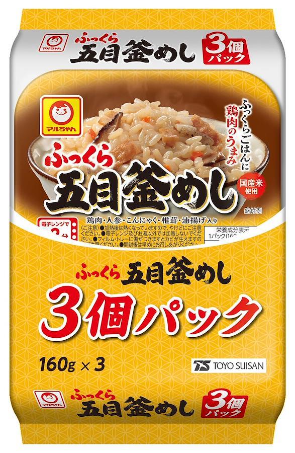 ふっくら仕上げた五目釜めし。鶏肉のうまみと醤油のやさしい味わい。5種類の彩り具材入り。ふっくら仕上げた五目釜めし。鶏肉のうまみと醤油のやさしい味わい。5種類の彩り具材(鶏肉、人参、こんにゃく、椎茸、油揚げ)入り。電子レンジで約2分でお召し上がりいただけます。※お湯で加熱する場合、約15分。