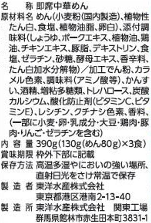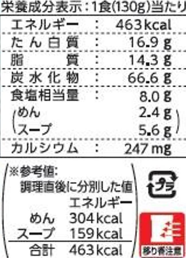 めん(小麦粉(国内製造)、植物性たん白、食塩、植物油脂、卵白)、添付調味料(しょうゆ、ポークエキス、植物油、鶏油、チキンエキス、豚脂、デキストリン、食塩、ゼラチン、砂糖、酵母エキス、香辛料、たん白加水分解物)/加工でん粉、カラメル色素、調味料(アミノ酸等)、かんすい、酒精、増粘多糖類、トレハロース、炭酸カルシウム、酸化防止剤(ビタミンC、ビタミンE)、レシチン、クチナシ色素、香料、(一部に小麦・卵・乳成分・大豆・鶏肉・豚肉・りんご・ゼラチンを含む)
