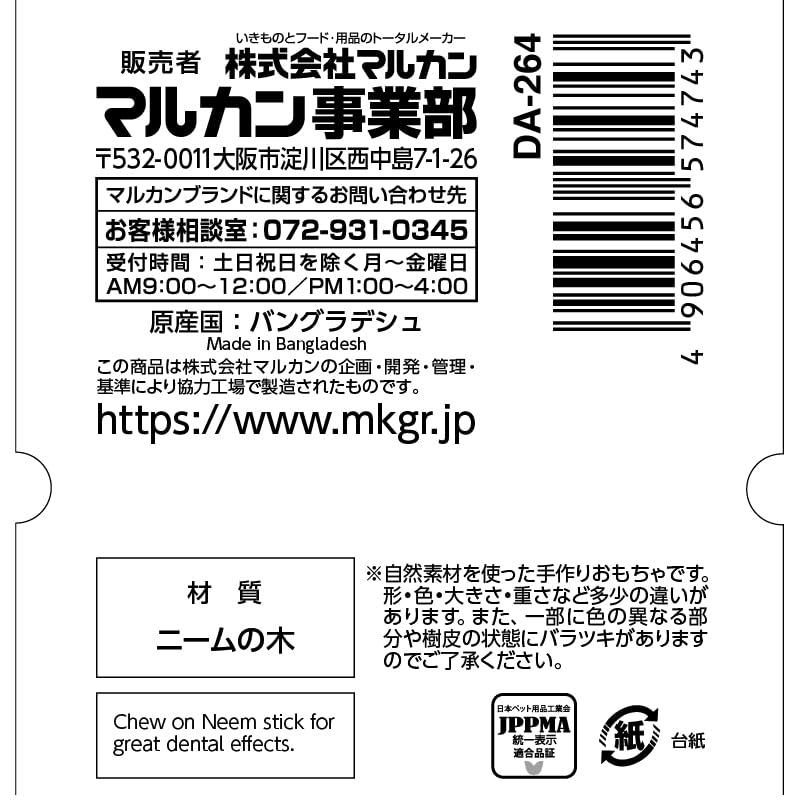 商品紹介 歯みが木のリニューアルとアイテム追加 インドの民間療法「アーユルヴェーダ」で薬木として位置づけられているニームの木を用い、犬が齧ることで口内の清潔を保つことができる棒状の玩具。 使用方法 おもちゃの使用に安全な環境である事を確認してからワンちゃんにおもちゃを与えてください。破損したおもちゃを誤飲すると重大な事故につながる事があります。割れる、折れるなど突起や破片が生じたら、使用を中止し、新しいものとお取り替えください。