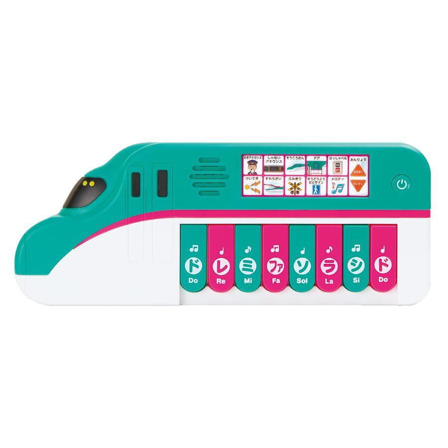 新幹線はやぶさのデザインのピアノです。新幹線や鉄道にまつわるサウンドが9種類、メロディが2曲収録されています。音当てゲームができるカード付き。単四電池2本使用(別売)。 JR東日本商品化許諾済