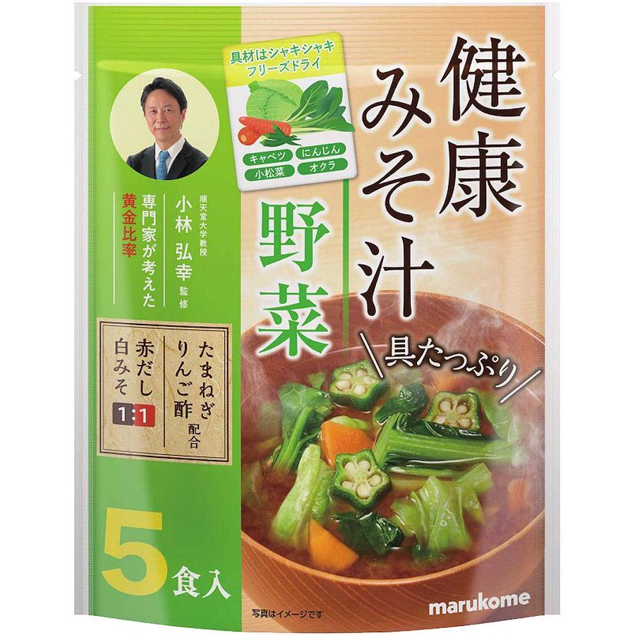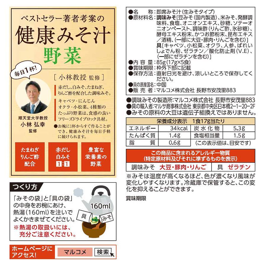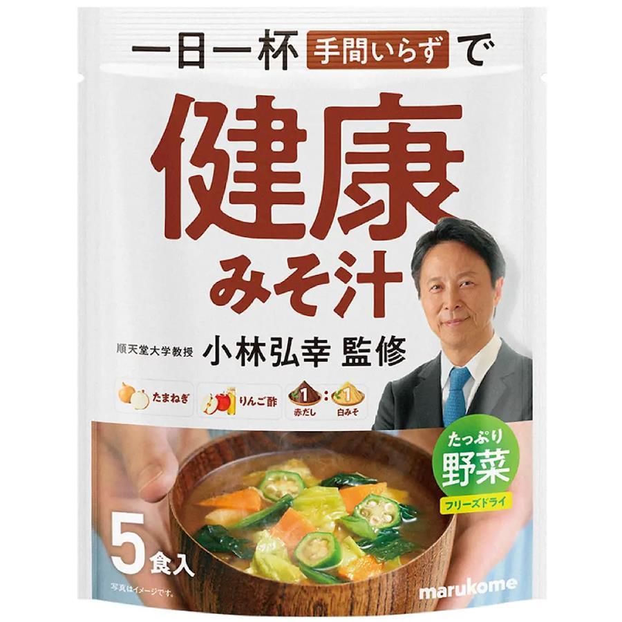 【医者が考案した「長生きみそ汁」】の著者、順天堂大学医学部小林弘幸教授監修の即席みそ汁です。調味みそはレシピを再現して赤だしと白みそ、たまねぎ、りんご酢を配合しました。具材には、キャベツ、にんじん、オクラ、小松菜の4種類の野菜をふんだんに使用しています。本物に近い、シャキシャキとした歯ごたえを実現するために、フリーズドライで仕上げました。1人前からすぐ作れるので毎日手軽に続けられます。