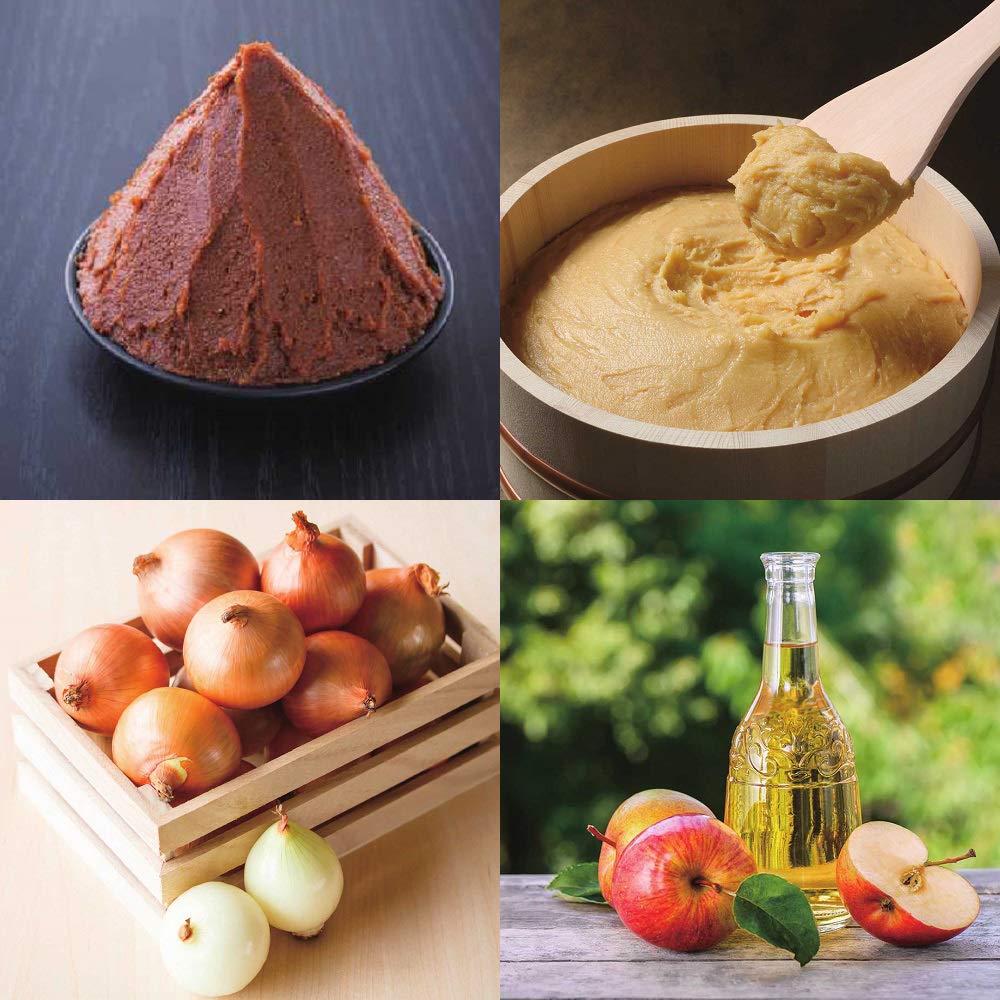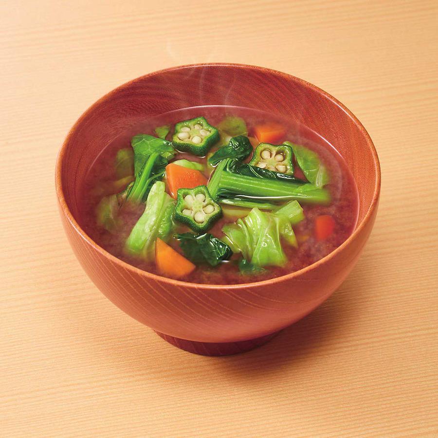 調味みそ[豆みそ(国内製造)、米みそ、発酵調味料、食塩、オニオンエキス、砂糖、ソテーオニオンペースト、調味酢(りんご酢、氷砂糖)、酵母エキス粉末、かつお節粉末、昆布エキス/酒精、(一部に大豆・豚肉・りんごを含む)] 具[キャベツ、小松菜、オクラ、人参、ばれいしょでん粉、ゼラチン/酸化防止剤(V.E)、(一部にゼラチンを含む)]