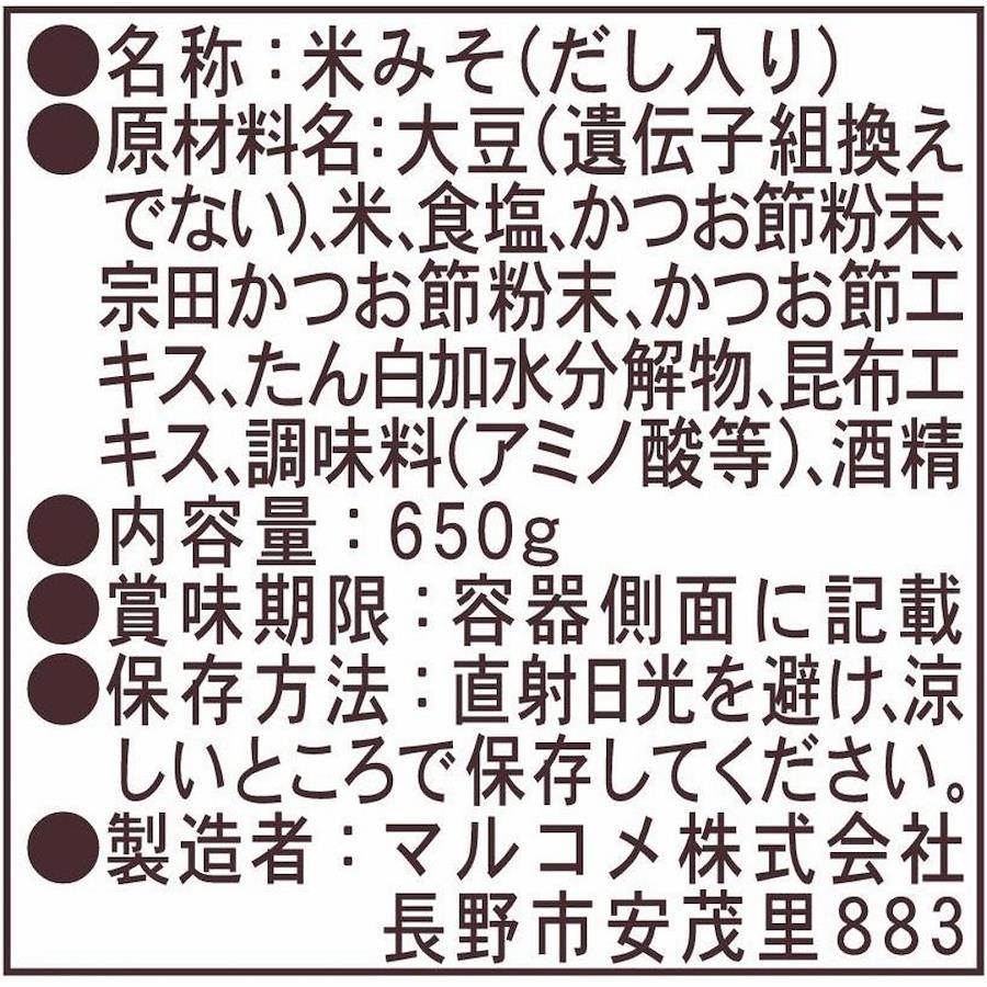【内容量】650gエネルギー:194kcal/100g当たり【原材料】大豆(遺伝子組換えでない)、米、食塩、かつお節粉末、宗田かつお節粉末、かつお節エキス、たん白加水分解物、昆布エキス、調味料(アミノ酸等)、酒精【マルコメ謹製】創業安政元年(1854年)マルコメ謹製「京懐石」。じっくり熟成した信州赤系みそを北海道の昆布・焼津の鰹節を中心に味を整えた。【塩分カット】塩分11.7%でどんな具材とも相性が良く、味噌の味をしっかり楽しみたい料理や鍋にも適する。日本古来の発酵食品を通して生活者の健やかな暮らしを応援。【重要】メーカーによる商品リニューアルに伴いパッケージ(内容量も含む)変更が行われた場合、新パッケージでお届け致します事ご了承願います。