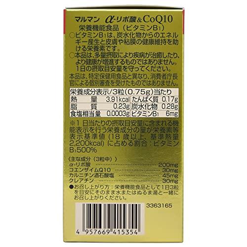 ●商品説明:ビタミンB1の栄養機能食品です。α-リポ酸を3粒中に200mg配合。さらに、コエンザイムQ10、L-カルニチン、クレアチン、ビタミンB1をプラスしました。毎日の美容・健康維持にお役立てください。栄養機能食品。●1日当たりの栄養所要量に対する充足率:ビタミンB1:600% 保存方法:直射日光や湿気の多い所を避け、涼しい所に保存してください。 お問い合わせ先:●販売者マルマン株式会社東京都千代田区内神田1-15-10TEL:03-5577-1130