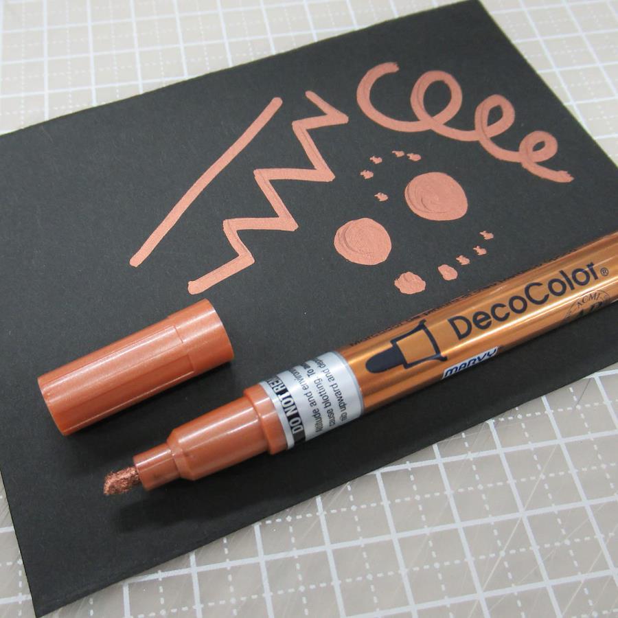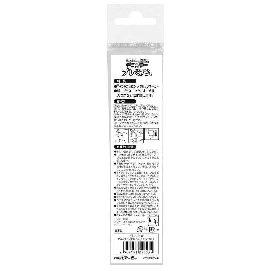 キラキラが映えるメタリック系油性顔料ペイントマーカー。海外でも人気のデコカラーのプレミアムメタリックシリーズ。カラーはゴールド、シルバー、カッパー、ローズゴールドの4色、ペン先は細字・カリグラフィー・チゼルの三種をご用意しました。お好きな色味とペン先を選んでください。紙、プラスチック、木、金属、ガラスなどに定着しますので、様々なシーンでペイントを楽しめます。セリース袋入寸法:幅40×高さ190×奥行16mm