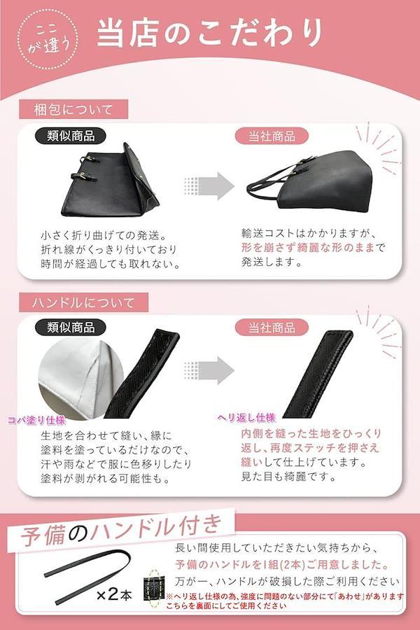 「満足頂ける機能を揃えました」防犯面やプライバシー面を考慮した天面ファスナー、直置きでも傷や汚れからバッグを守る底面に鋲付き、一般的なPUレザーに比べて傷が付きにくく型崩れやシワになりにくいクロス(十字)パターン加工、一般的に日常で生活する際の水濡れなどなら守る防水加工、3段階に調整可能な持ち手。