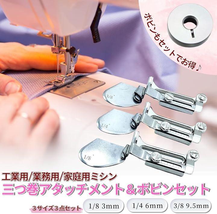工業用、職業用、家庭用などでお使いいただける三つ巻ラッパ(ミシン押さえ)のボビンセットです。