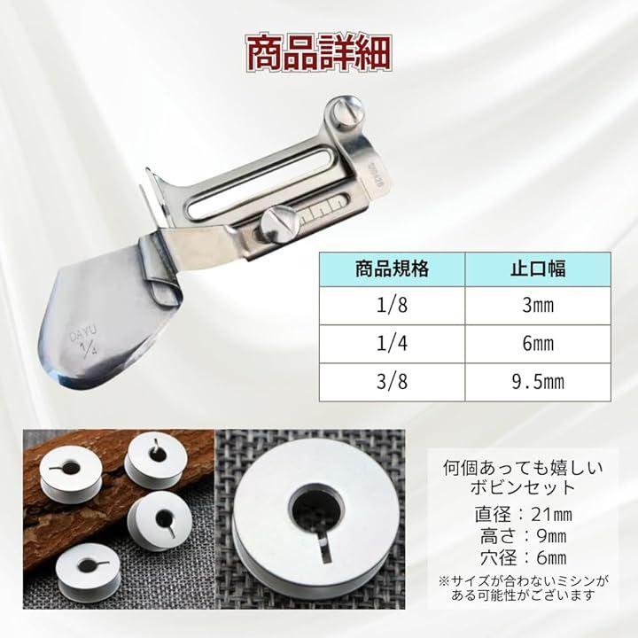 バリエーションとしてはミシン押さえ3個(ボビン1個)、ミシン押さえ3個(ボビン3個)、ミシン押さえ3個(ボビン5個)をご用意しております。